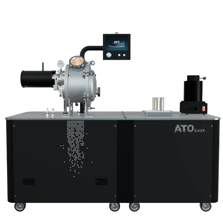 Sharing fundamental traits with the ATO Lab, the ATO Noble is an ultrasonic metal powder atomiser fine-tuned for the production of precious metal powders. It caters to the demands of customers seeking a cost-effective method for atomising costly and scarce metal alloys. Thanks to its unrestricted minimum load capacity and the ease with which it can switch between materials, it guarantees cost efficiency and unparalleled control over the atomisation process.